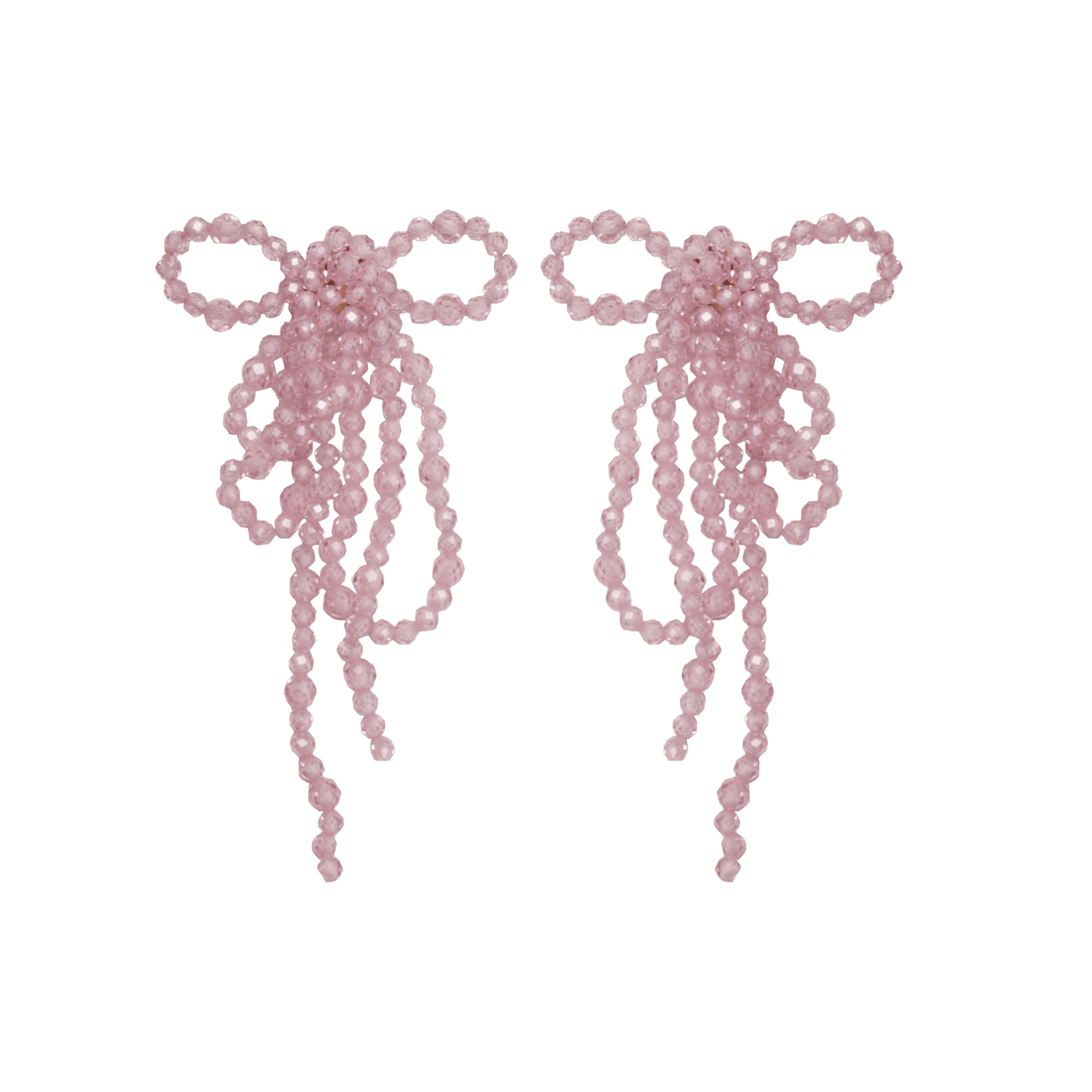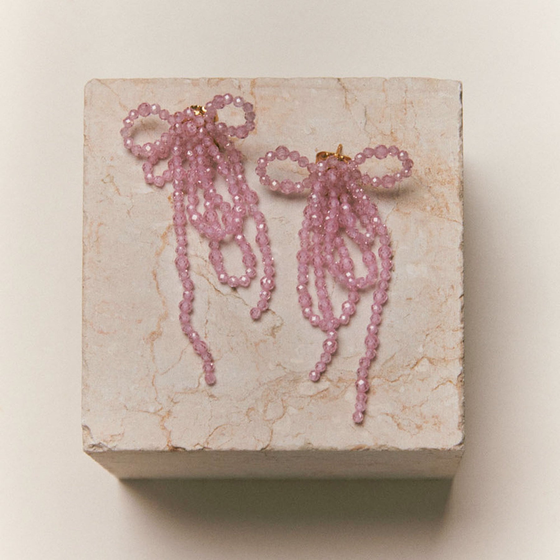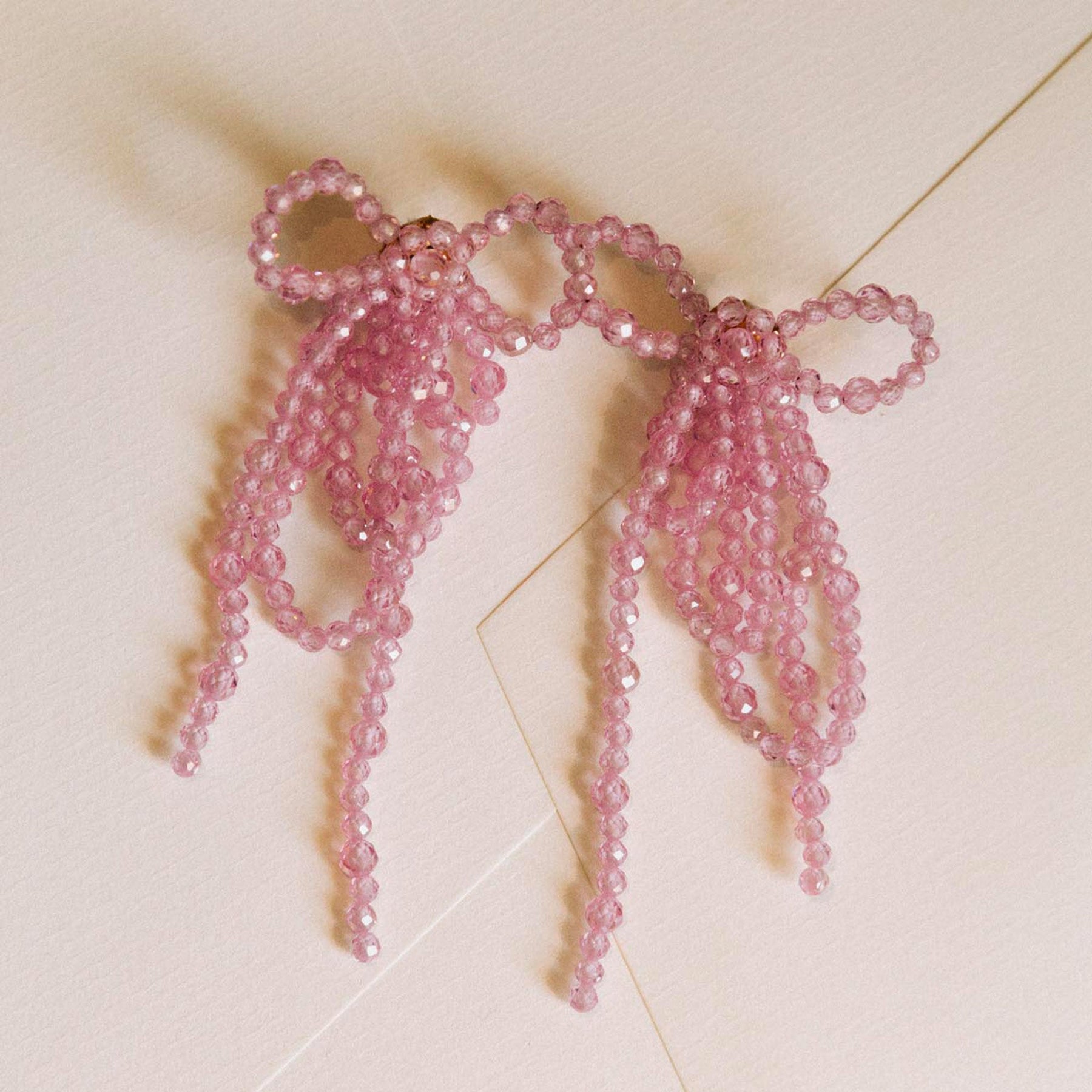 Die Isis Rose Ohrringe von Alhaja sind kunstvoll gefertigte Schmuckstücke aus roséfarbenen Steinen, die einzeln von Hand auf feinen Nylonfäden aufgefädelt und zu zarten, romantischen Schleifen geformt werden. Die filigrane Handarbeit und das raffinierte Design machen jedes Paar zu einem einzigartigen Kultobjekt.