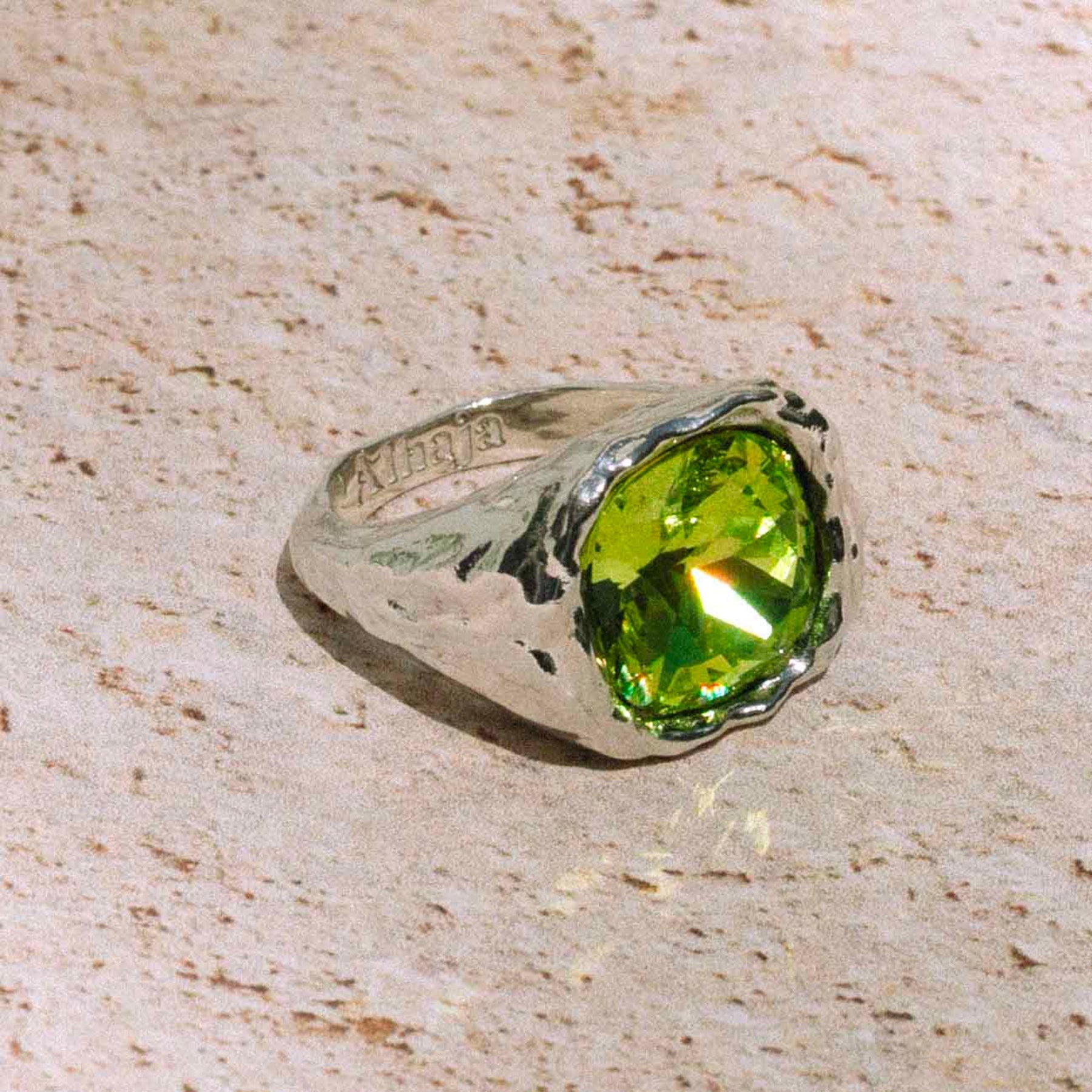 Der Amalfi Ring von Alhaja zeigt sich hier erstmals in edlem 925er Sterling-Silber. Die Kombination aus kühlem Silber und einem limonengrünen Kristall verleiht ihm eine frische, verspielte Ausstrahlung. Der leuchtende Limeton, eine Mischung aus Grün und Gelb, steht für Ruhe, Lebensfreude und Leichtigkeit.