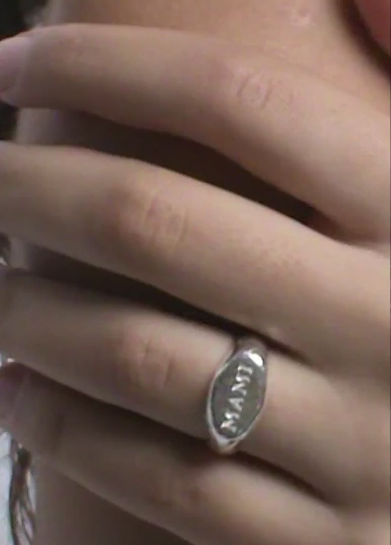 Alhaja interpretiert mit dem Ring Mami Signet den klassischen Siegelring auf moderne, persönliche Weise. Der vergoldete Ring setzt einen klaren Akzent und verbindet grafische Typografie mit warmer Goldfarbe.