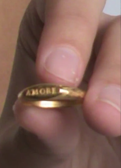 Im Zentrum des Rings steht ein längliches, horizontal ausgerichtetes Oval, das sich sanft aus der Ringschiene erhebt. Die Übergänge sind leicht verjüngt, wodurch eine fließende, gut proportionierte Form entsteht. Die Oberseite des Ovals zeigt den vertieft eingeprägten Schriftzug „AMORE“. Die Buchstaben wirken matt und zurückhaltend, während die umliegende Fläche glänzend und leicht strukturiert erscheint. Der Ring besteht aus Messing und ist mit 18 Karat Gold in 3 Mikron Stärke vergoldet. Die einheitliche Goldfarbe unterstreicht den klaren Charakter des Siegelrings, der ohne Steine oder zusätzliche Ornamente auskommt.