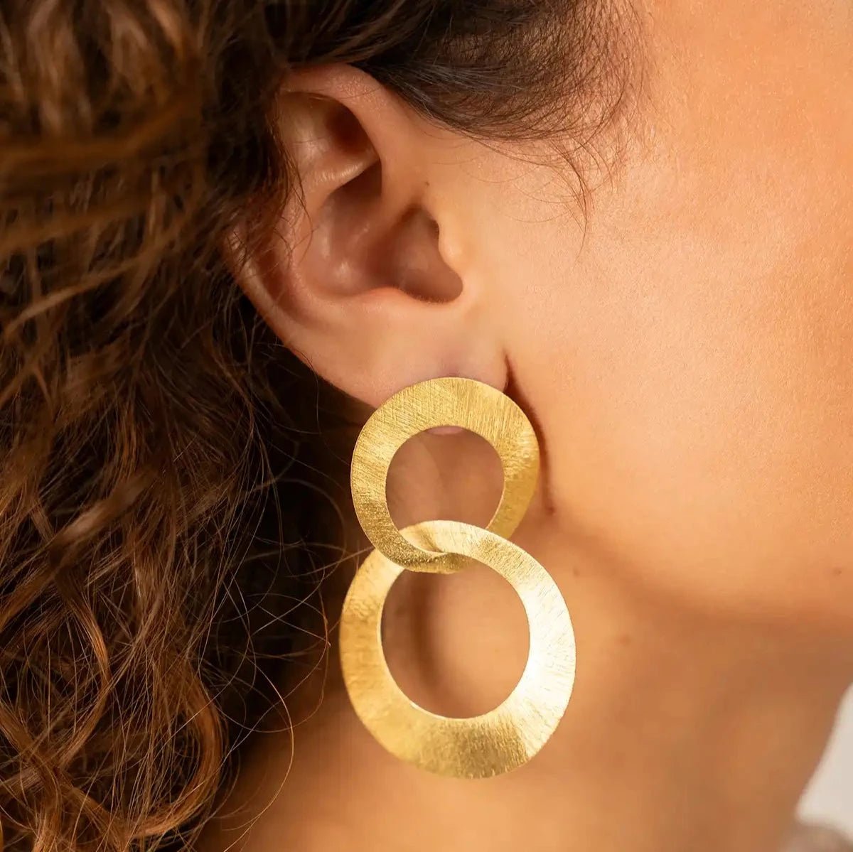 Jeder Ohrring besteht aus zwei flachen, ringförmigen Elementen, die vertikal angeordnet und ineinander greifend verbunden sind. Der kleinere obere Ring führt in den deutlich größeren unteren Ring, wodurch eine sanft bewegliche, fließende Silhouette entsteht. Beide Ringe zeigen eine fein strukturierte, matt wirkende Oberfläche mit gleichmäßigen, leicht radial verlaufenden Linien, die dem Goldton eine ruhige, satinierte Anmutung verleihen. Gefertigt sind die Ohrhänger aus 925 Sterlingsilber, das vollständig vergoldet ist. Die klare Kreisform, die gleichmäßige Breite der Ringbänder und die symmetrische Anordnung beider Elemente ergeben ein ausgewogenes, grafisch wirkendes Schmuckbild. Es sind keine Steine oder zusätzlichen Verzierungen vorhanden, der Fokus liegt ganz auf Form und Oberfläche.