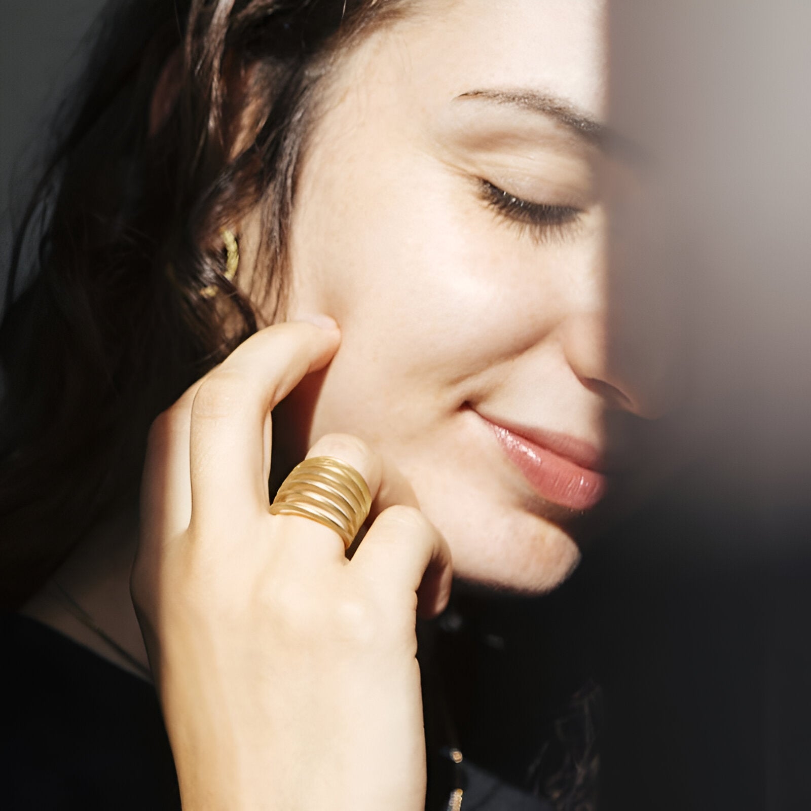 Der „Mir Six“ Ring von Susi Cala setzt auf ein spannendes Design aus sechs feinen Elementen, die zu einer harmonischen Einheit verschmelzen. Gefertigt aus 925er Sterlingsilber und hochwertig vergoldet, überzeugt er durch seine edle Ausstrahlung. Der Ring wirkt modern und zugleich zeitlos, was ihn zu einem vielseitigen Begleiter für Alltag und besondere Momente macht. Besonders schön harmoniert er mit schlichten Armbändern oder weiteren Ringen aus der Kollektion.